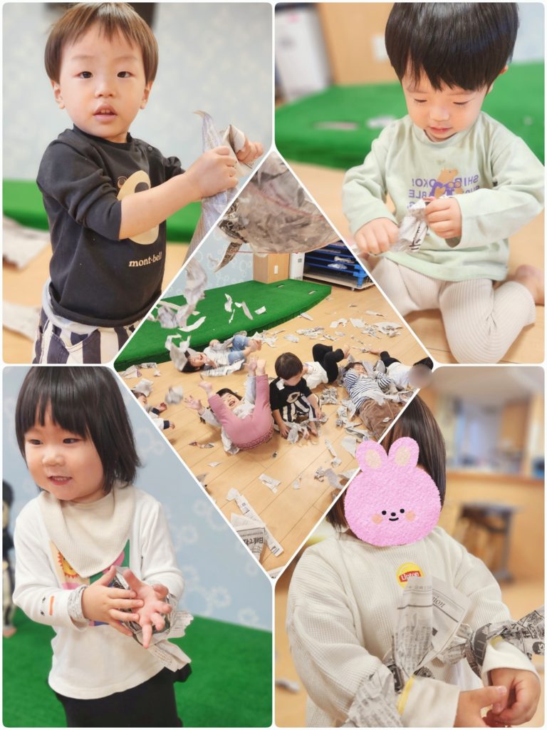 最後にちぎった新聞紙を傘の中に入れて、雨のようにパラパラと降らせると大喜び!お友達と一緒にはしゃいでいましたよ♪